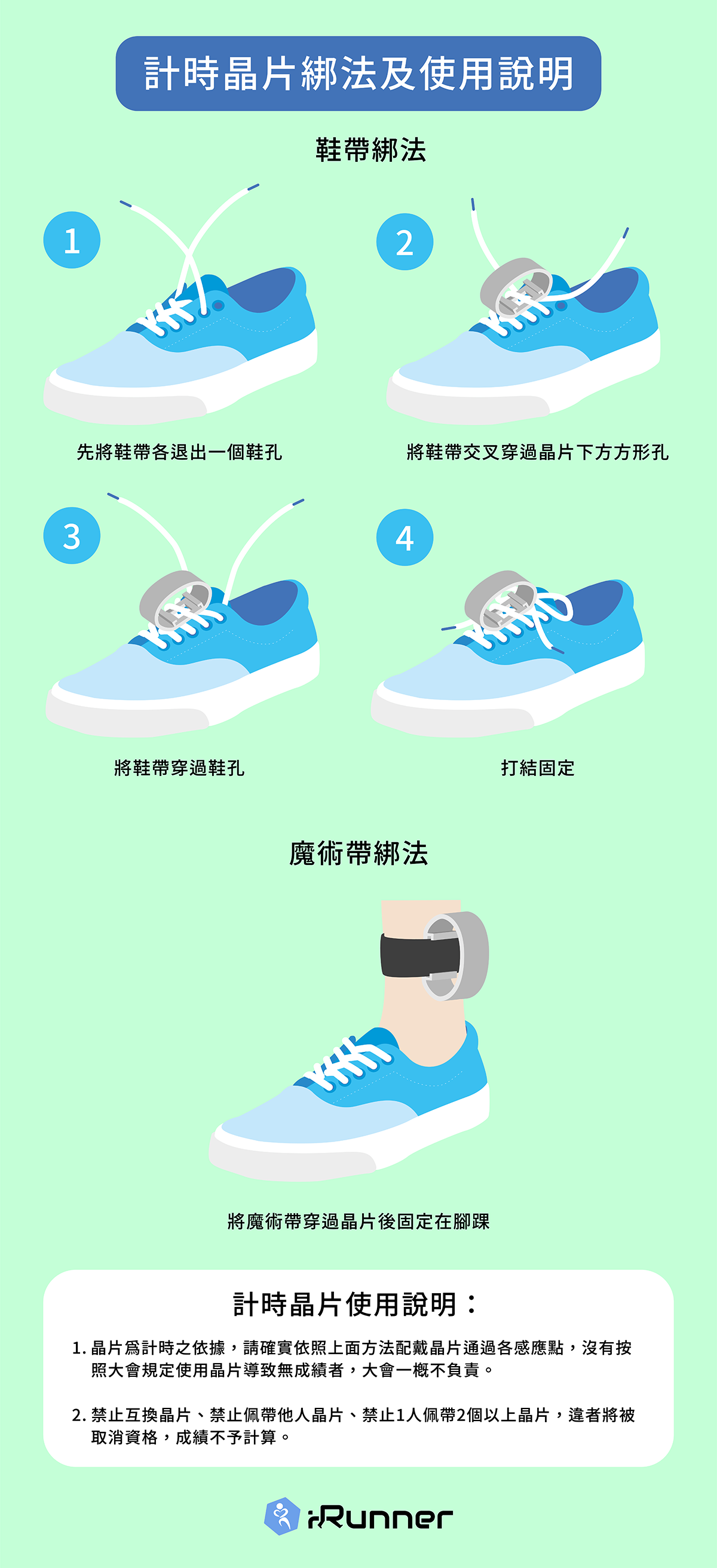 PS: 晶片有綁好,計時沒煩惱。 晶片綁的方式/位置都將影響到感應機率,若某個感應點未感應成功,就需至成績異常處理區花費10分鐘處理,並可能錯失上頒獎台的機會。