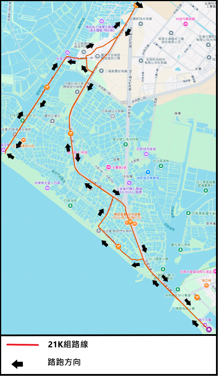 ◆ 21K 組: 觀夕平台 → 漁濱路 → 四草大橋 → 四草大道 → 四草大道81巷 → 北汕尾一路83巷 → 北汕尾二路 → 顯草街 → 媽祖宮一街 → 左轉 媽祖宮一街345巷 → 府城天險 折返→ 媽祖宮一街 → 媽祖宮路 → 北汕尾三路 →北汕尾二路 → 北汕尾一路 → 右轉 四草大道 → 四草大橋 → 漁濱路 → 觀夕平台。 |
