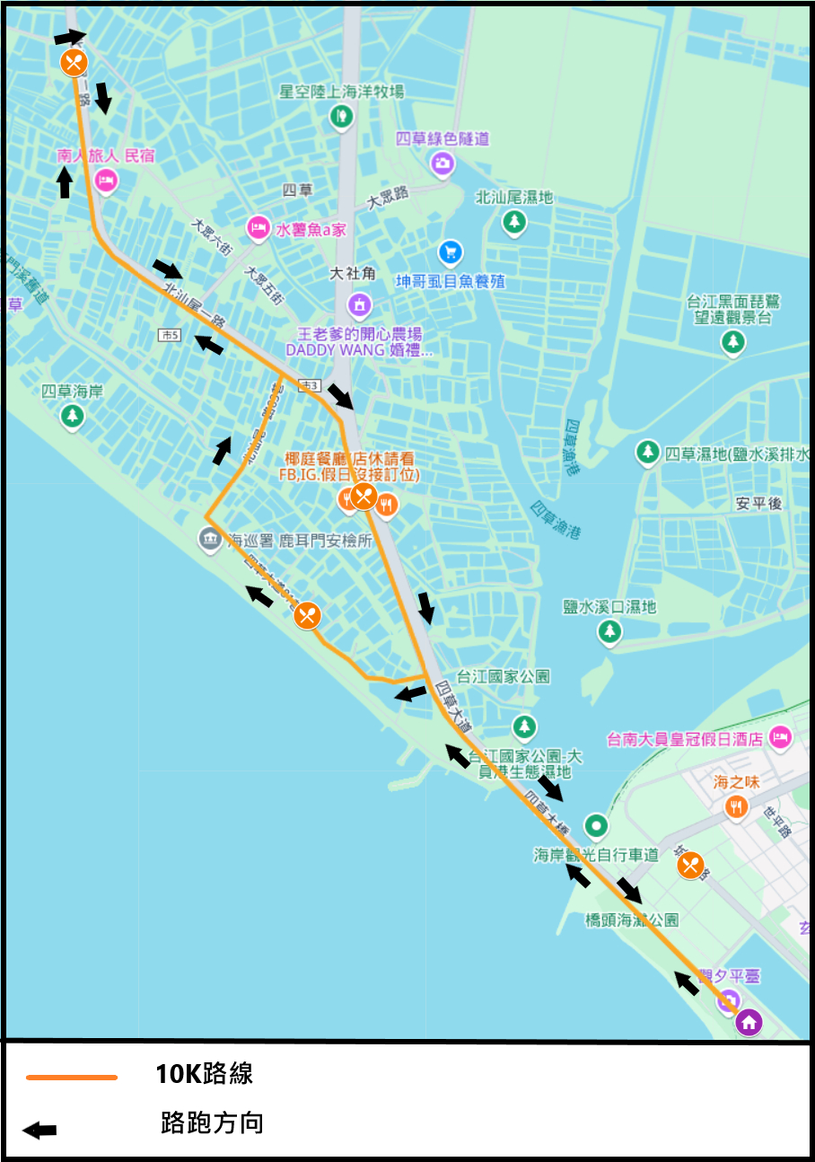 ◆ 10K 組: 觀夕平台 → 漁濱路 → 四草大橋 → 四草大道 → 四草大道81巷 → 北汕尾一路83巷 → 北汕尾二路 → 北汕尾一路 → 右轉 四草大道 → 四草大橋 → 漁濱路 → 觀夕平台。 |