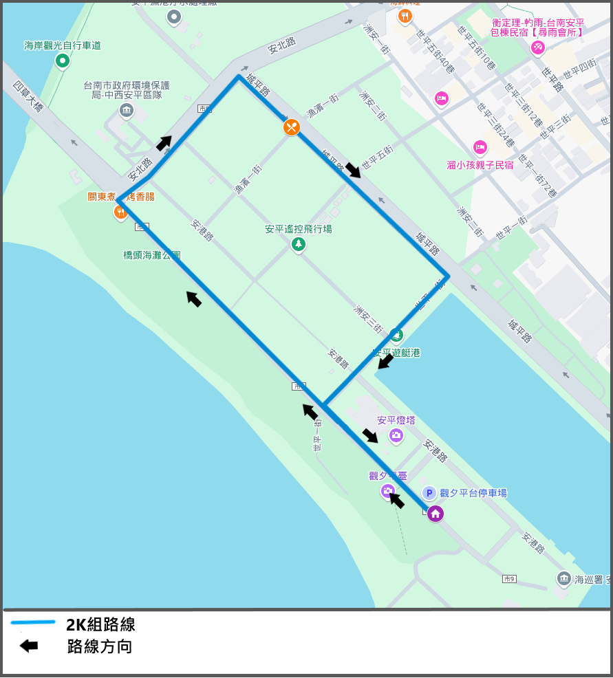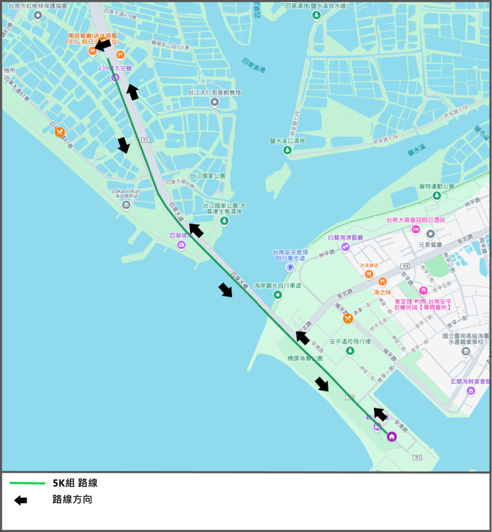 5K 組: 觀夕平台 → 漁濱路 → 四草大橋 → 四草大道 → 折返 → 四草大橋 → 漁濱路 →觀夕平台。 |