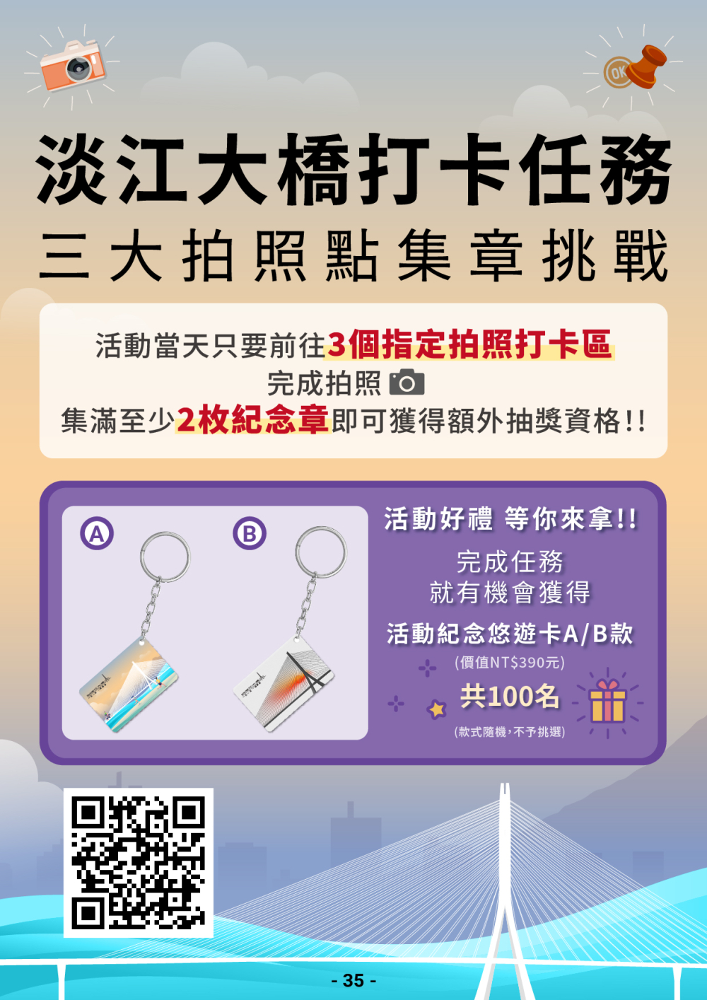4月18日「路跑活動」規劃21K新市鎮探索組、10K輕軌繞行組及5K大橋漫遊組;及4 月19日「自行車活動」設置50K環山挑戰組及20K淡江大橋逍遙遊組),活動物資已陸續寄出,若有問題或想取得大會資訊,請至官方報名網站(https://irunner.biji.co/2026DanjiangBridgeOpeningRun)查詢或洽02-8772-1035專線。