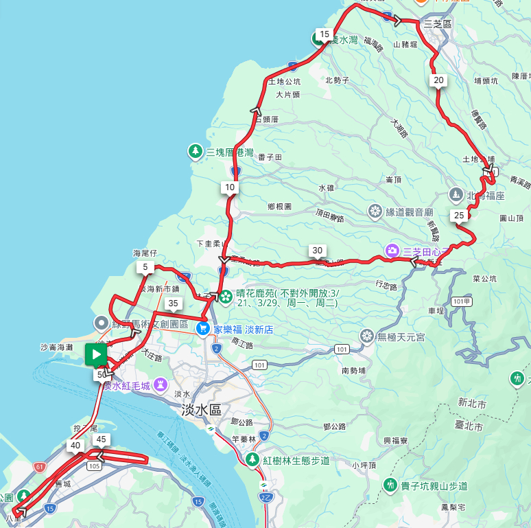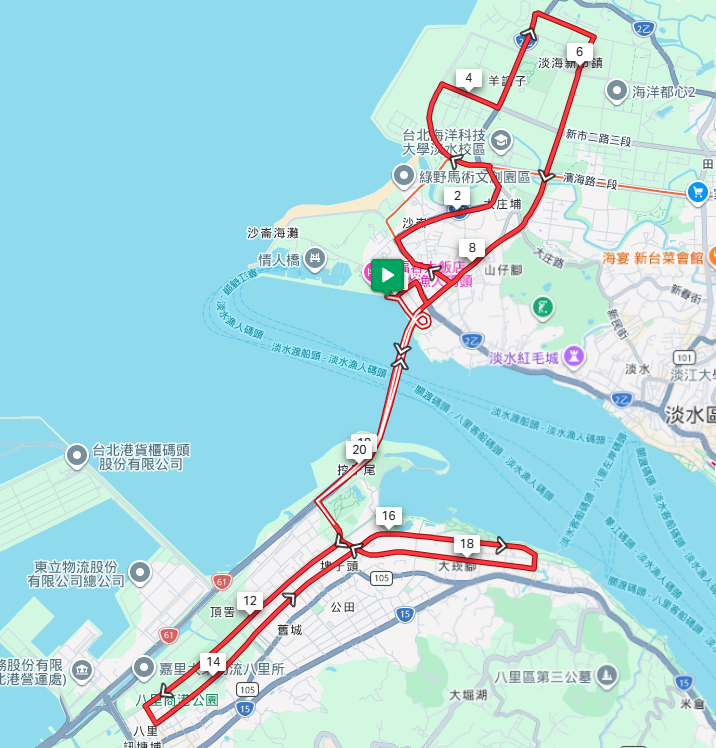 漁人碼頭廣場→中正路二段51巷→右轉中正路二段(台二乙)→左轉沙崙路→左轉淡海路→右轉中正路二段(台二乙)→右轉中正路二段(台二乙)→左轉濱海路三段(台二乙)→直行濱海路三段)→右轉新市二路一段→左轉後州路一段(台二乙)左轉中山北路三段→順向靠右行駛淡金路三段(台二)→沿淡金公路直行(台二)→右轉中興街一段(三芝市區)→中興街二段→右轉中正路三段(101縣道)→北新路(101縣道)→右轉奎柔山路(北8) →左轉淡金路三段(台二)→右轉新市二路四段→左轉沙崙路一段→新民隧道→沙崙路→淡江大橋→左轉忠孝路→右轉博物館路→左轉商港六路→左轉商港一路→仁愛路→觀海大道→右轉忠孝路→右轉淡江大橋→濱海匝道→左轉中正路二段51巷,共計50.9K。(實際路線及里程數依淡江大橋最終完工為主) |