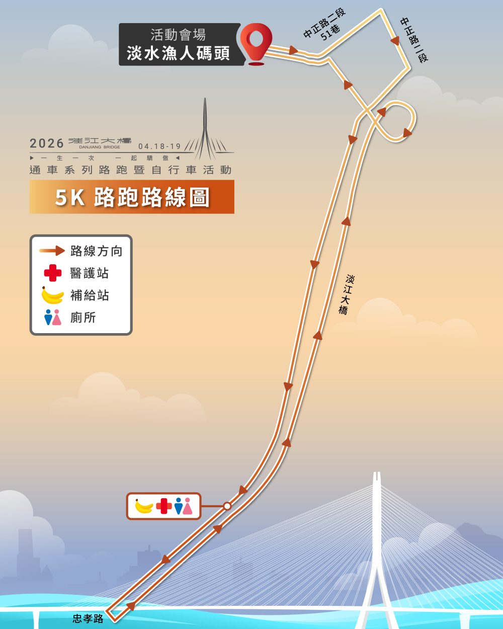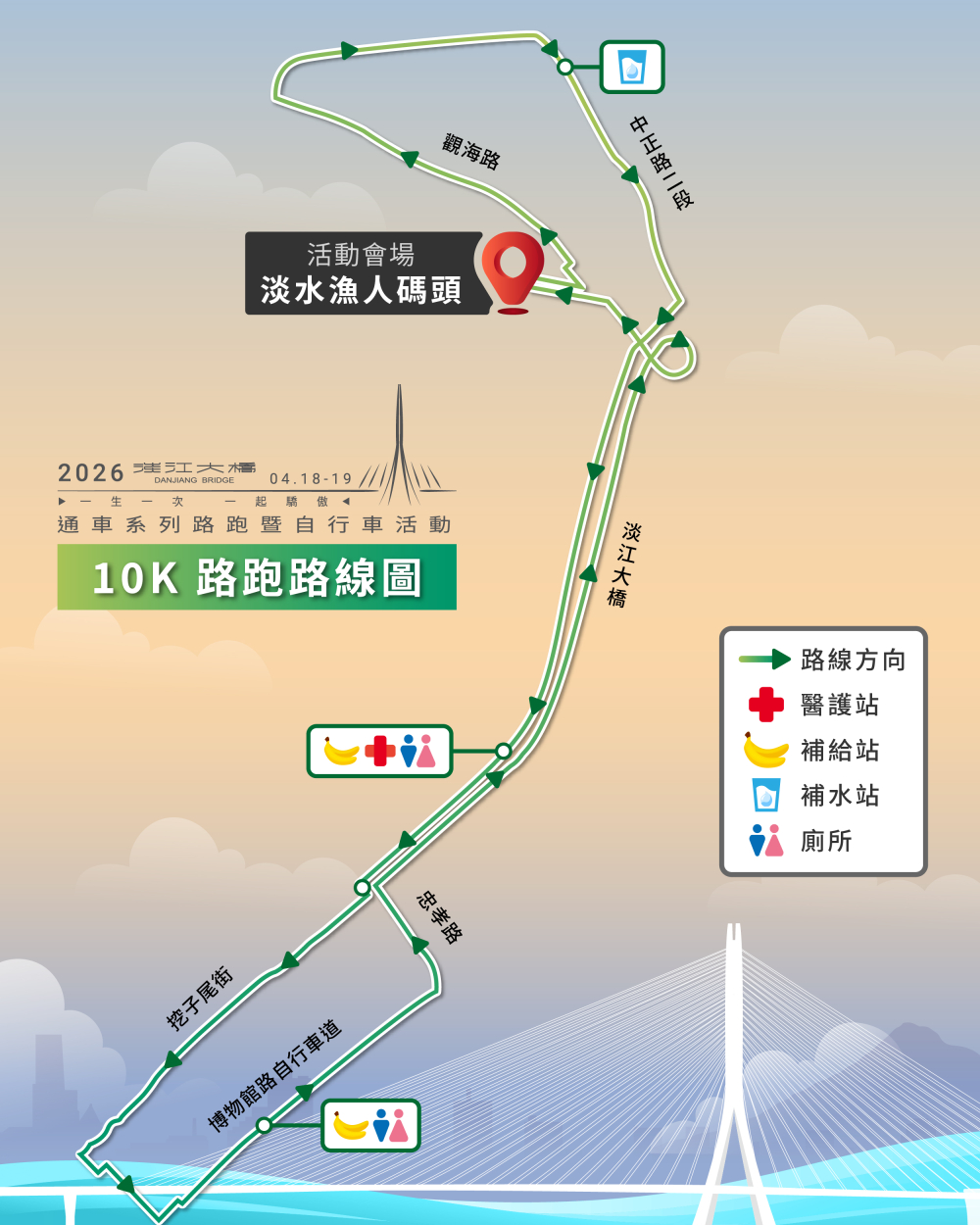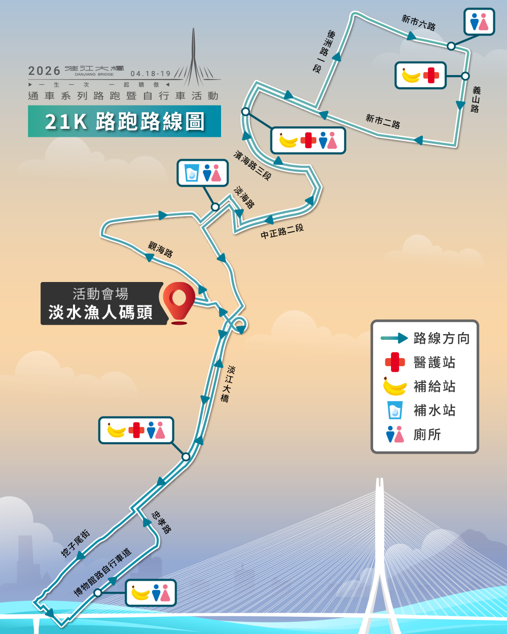 - 活動路線:漁人碼頭廣場(起點)→中正路二段51巷→右轉中正路二段→右轉沙崙路→淡江大橋(下橋後迴轉順向)→淡江大橋→左轉中正路二段→左轉中正路二段51巷→漁人碼頭廣場(終點)(實際路線及里程數依淡江大橋最終完工為主)