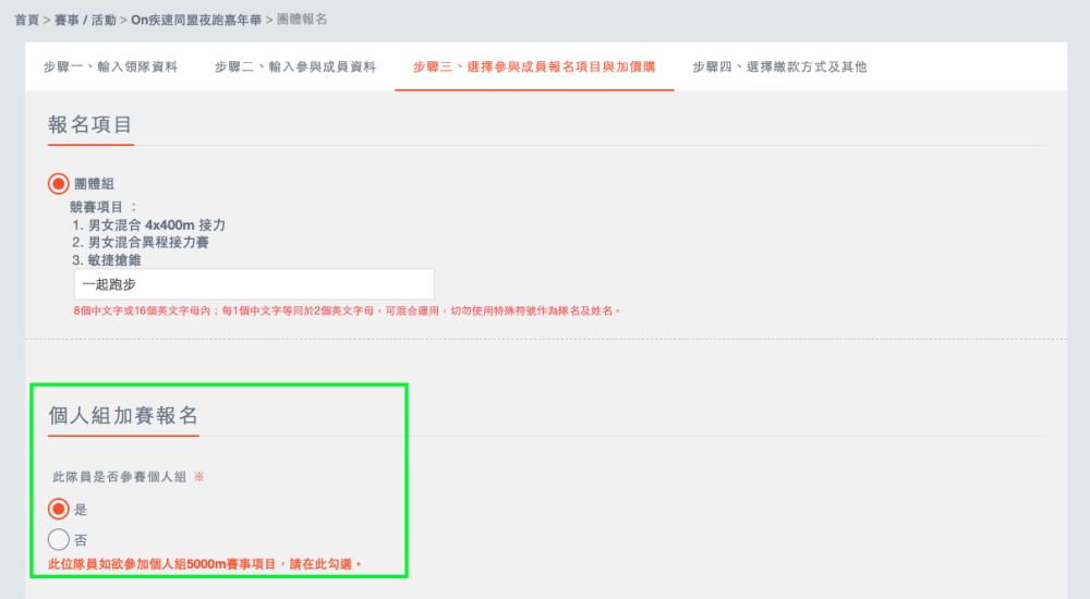 想要同時登記個人組5,000m,並且已經揪團登記團體組的跑者們,該如何報名呢?請按照以下步驟操作👇