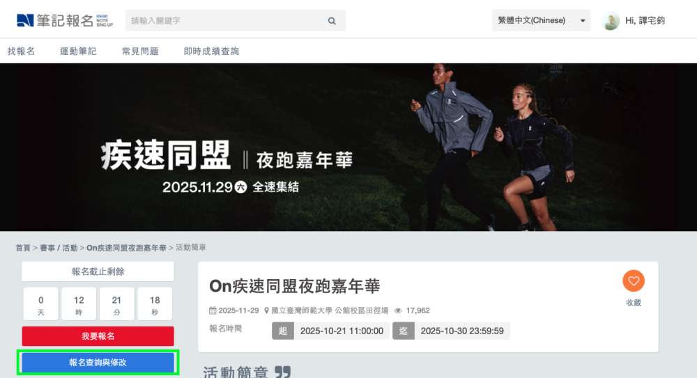 ♦︎ 如果在團體報名前,已經登記抽籤個人組的跑者,請協助於「報名查詢與修改」的頁面取消個人組報名的訂單,完成後即可在團體報名中加入您成為隊員,並且記得依照上方的步驟,勾選參加個人組的登記抽籤喔!