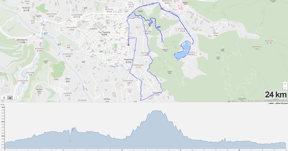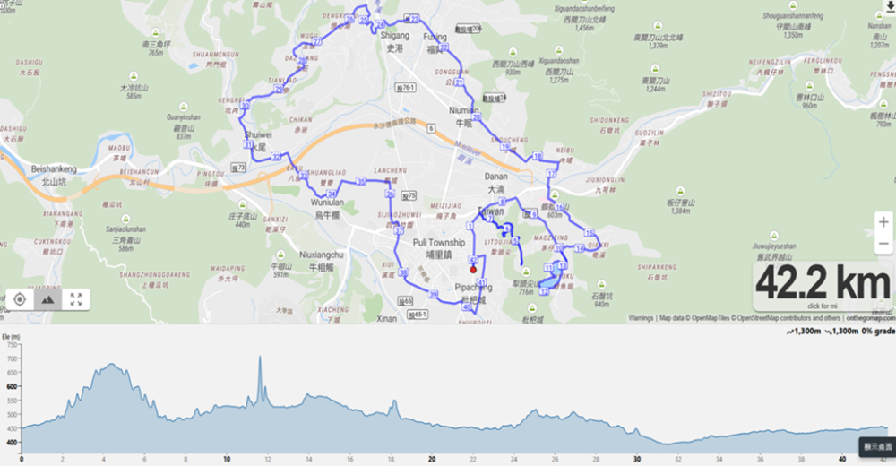 南投縣國立埔里高級工業職業學校第二校區(會場)-和平東路-中山路右轉-地理中心碑-中山路右轉-鯉魚路右轉-鯉魚潭逆時針環潭-鯉魚路--中山路左轉-地理中心碑-知安路飛行傘起降場折返-地理中心碑-中山路左轉-埔里高工-中心路左轉-枇杷社區-哲學步道-地母廟-枇杷路右轉-枇杷大排右轉-慈恩社區-慈恩二號橋左轉-慈恩街-中心路-中心路犁頭尖左轉-和平東路左轉-南投縣國立埔里高級工業職業學校第二校區(會場)
