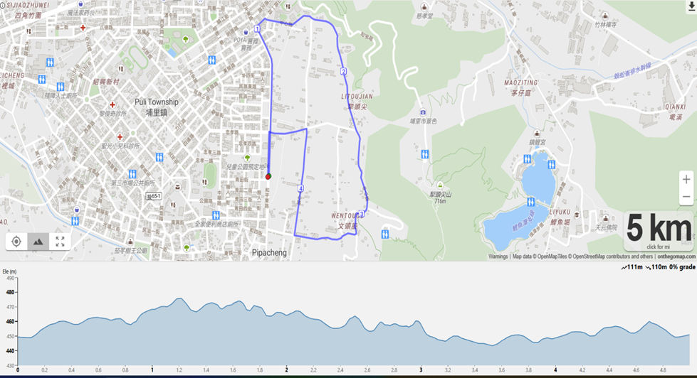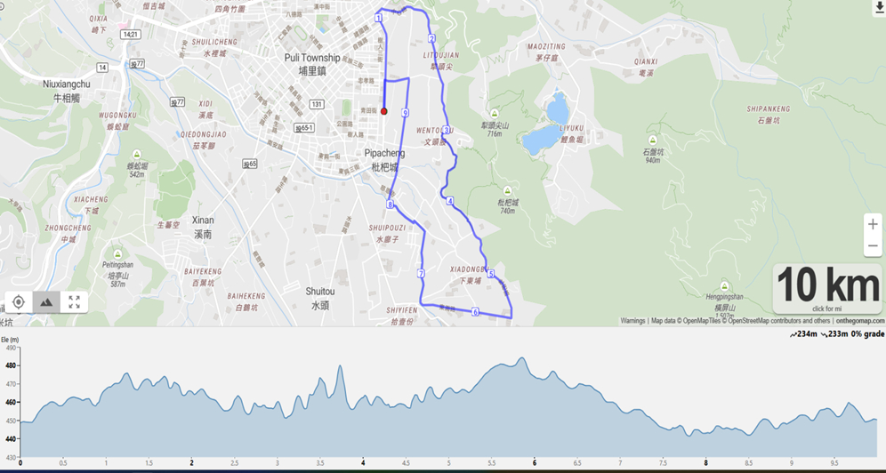 南投縣埔里鎮國立埔里高級工業職業學小第二校區(會場)-和平東路-中山路右轉- 埔里高工-中心路右轉-枇杷社區-哲學步道-天旨宮岔路右轉-文頭股-中心路右轉-中心路犁頭尖左轉-和平東路左轉-南投縣埔里鎮國立埔里高級工業職業學小第二校區(會場)