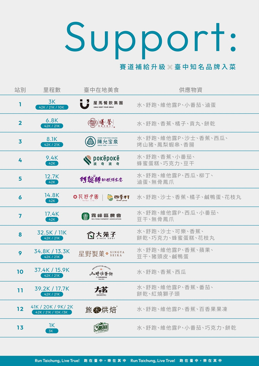 - 六、贊助單位:財團法人臺中市體育教育基金會、全國大飯店、百匡優娜、旅禾烘焙、舒跑、有熊運動、屋馬餐飲集團、膳馨餐飲集團、PokéPoké · 波奇波奇、大茗本位製茶堂、陳允寶泉、星野製菓、小時候蛋餅、巧經松按摩機、岱宇國際股份有限公司、喬光科技、BodyVine巴迪蔓、老井極上燒肉、ISUZU台北合眾汽車有限公司、阿聰師的糕餅主意、3點1刻、霧峰區農會、大苑子、花好月圓 茶飲專賣、四季村自助餐廚坊、阿勝師