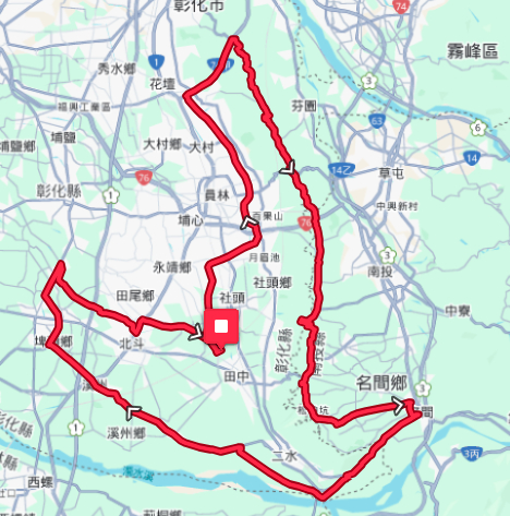 路線說明:會場(田中 高鐵站區)->東彰路 往社頭、員林->東彰北路一段->右轉台74甲(彰化東外環),爬坡路段->右轉八卦山脈139縣道往南->139乙->名間 右轉南田路139乙->139乙松柏嶺->名松路二段->右轉頂廓巷->小崎巷->右轉152縣(員集路)->二水 左轉 水森路->引水公園->濁水溪北岸產業道路->溪州 152縣往西->穿越台1線->莿桐埤 堤岸道->埤頭 右轉台19->右轉 彰水路(台19)->鹿島橋 右轉舊濁水溪(東螺溪)北岸水防道路->北斗 左轉台1線->田尾 右轉 富農路->大社路->終點/會場(田中高鐵站區)