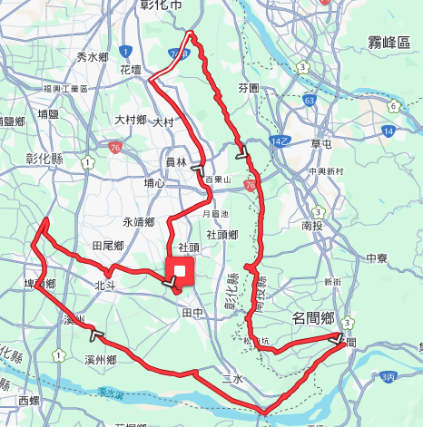 路線說明:會場(田中 高鐵站區)->東彰路 往社頭、員林->東彰北路一段->右轉台74甲(彰化東外環),爬坡路段->右轉八卦山脈139縣道往南->139乙->名間 右轉南田路139乙->139乙松柏嶺->名松路二段->右轉頂廓巷->小崎巷->右轉152縣(員集路)->二水 左轉 水森路->引水公園->濁水溪北岸產業道路->溪州 152縣往西->穿越台1線->莿桐埤 堤岸道->埤頭 右轉台19->右轉 彰水路(台19)->鹿島橋 右轉舊濁水溪(東螺溪)北岸水防道路->北斗 左轉台1線->田尾 右轉 富農路->大社路->終點/會場(田中高鐵站區)