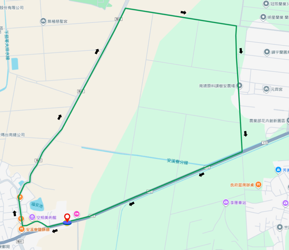 安溪國小 起點 → 右轉 南81鄉道 → 右轉 產業道路 → 右轉 產業道路 → 右轉 市道172線 → 安溪國小 終點。