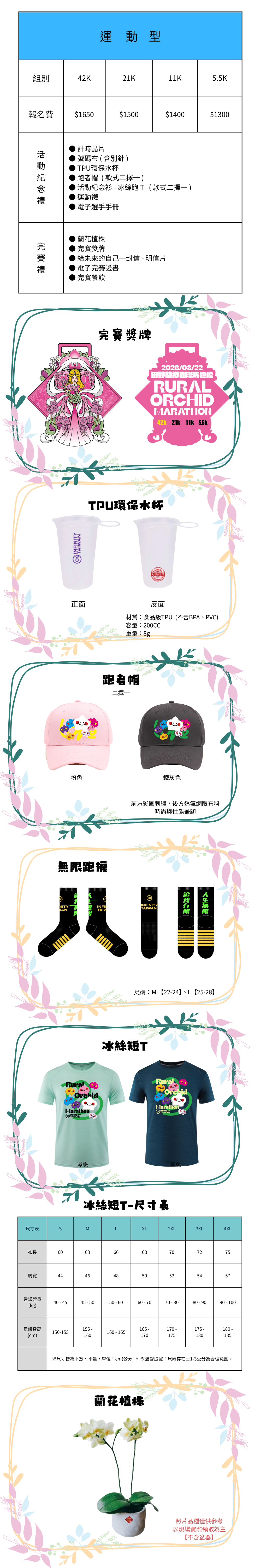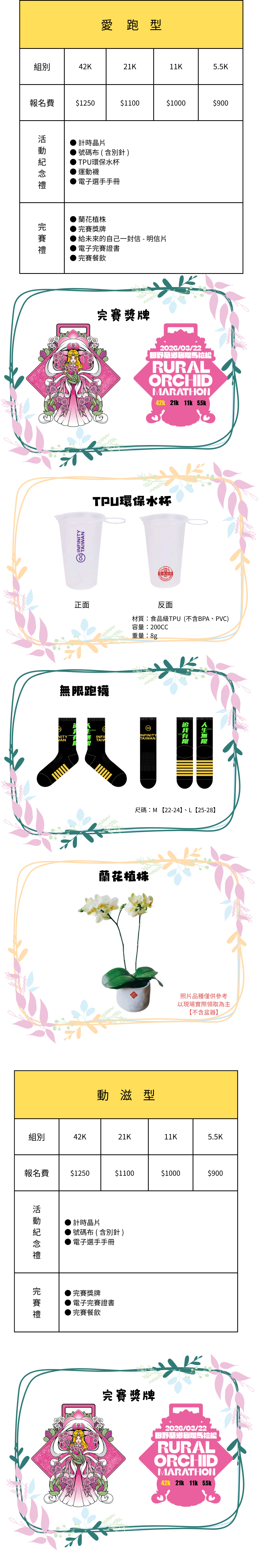 完 賽 禮 | ●蘭花植株 ●完賽獎牌 ●給自己未來一封信 - 明信片 ●電子完賽證書 ●餐飲 | ||||