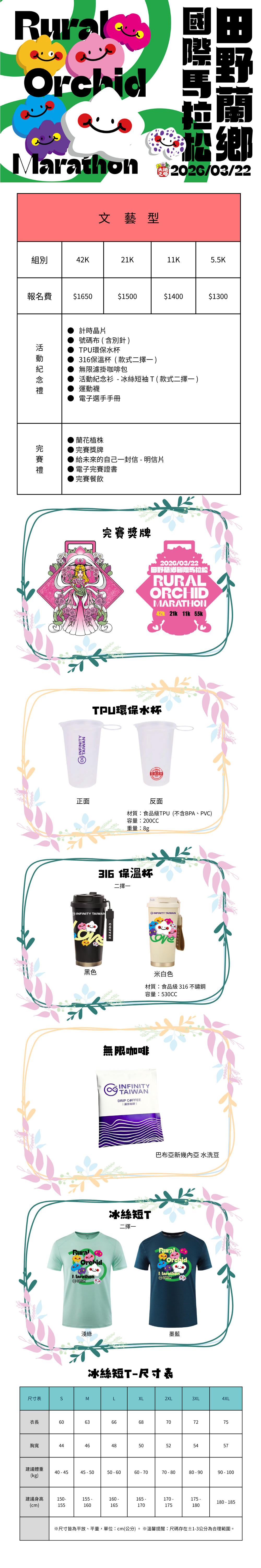 活 動 物 資 | ●計時晶片 ●號碼布(含別針) ●TPU水杯 ●316保溫杯 (2擇1) ●咖啡包 ●紀念衫-冰絲跑T (2擇1) ●無限跑襪 ●電子選手手冊 | ||||