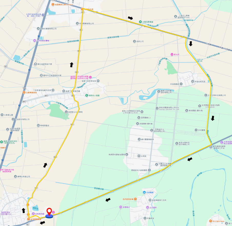 安溪國小 起點 → 市道172線 → 右轉 南81鄉道 → 右轉 172甲 → 右轉 嘉南大圳北幹線自行車道 → 右轉 市道172線 → 安溪國小 終點。