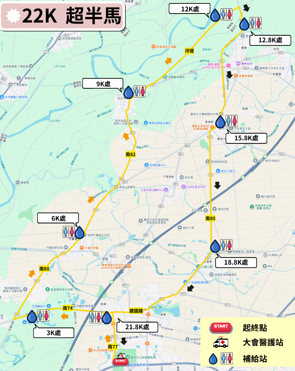 22K 超半馬路線 路線說明:起點 新營體育場 → 南77 → 左轉 南74 → 右轉 南80 → 左轉 南82 → 左轉 河堤 → 左轉 八掌二橋 → 右轉 南85 → 後廓外環道 → 南85 → 右轉 南74 → 建國路 → 南77 → 終點 新營體育場。 |