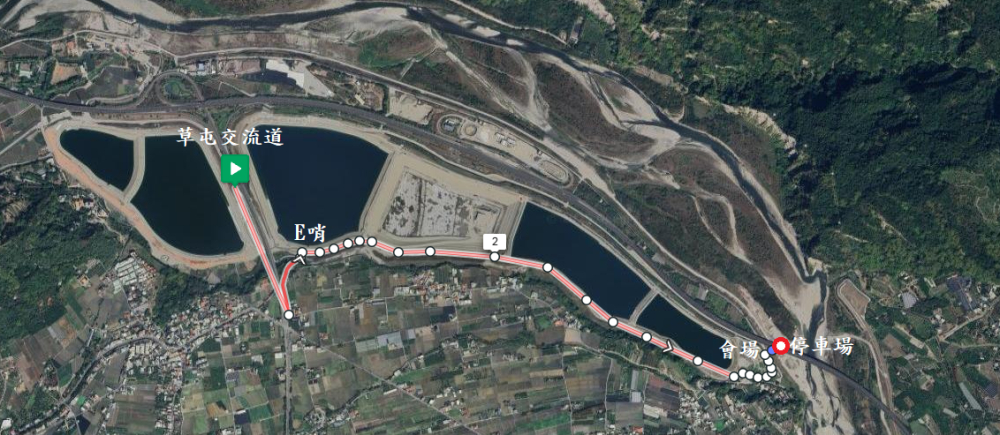 停車動線:下東草屯交流道第一個紅綠燈左迴轉(依指標行駛),進入人工湖連絡道直行,進入鳥嘴潭人工湖草屯入口(E哨)右轉,沿人工湖車道至管理處停車場右轉進入砂石車專用道停車。