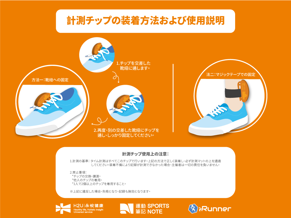 - 本大会はスポーツ専用のタイム計測チップを使用しています。下記図解に従って正しく装着してください。不適切な装着による感知不良の結果については大会側は責任を負いません。