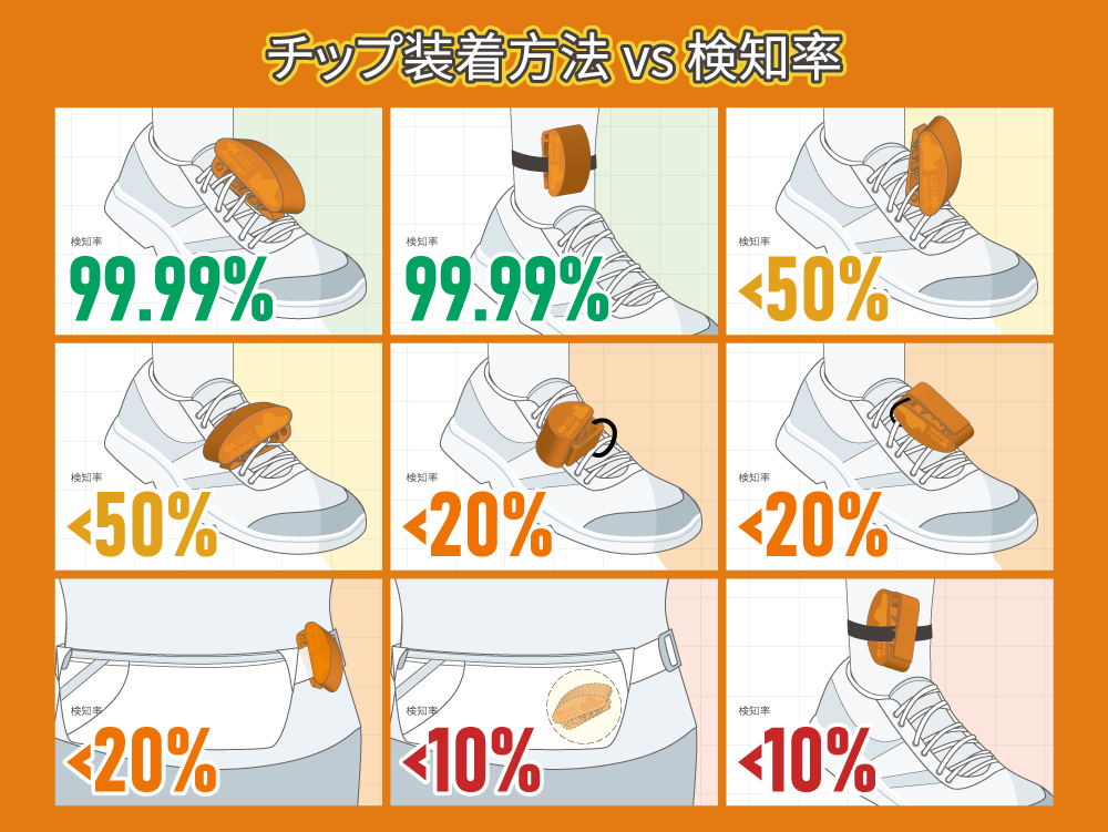 - チップが靴ひもにしっかり結ばれていない場合や、金属製品での固定により脱落した場合、記録が無効となっても自己責任となります。