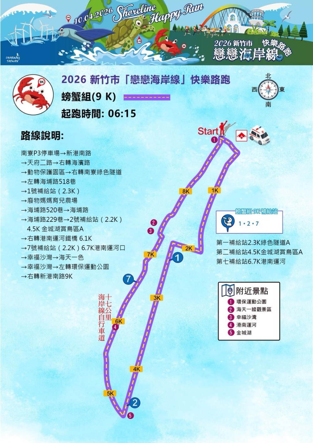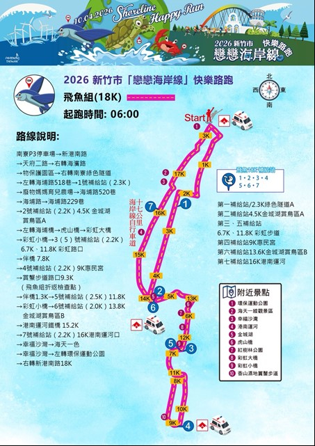 南寮P3停車場→新港南路→天府二路→右轉海濱路→動物保護園區→右轉南寮綠色隧道→左轉海埔路518巷→1號補給站(2.3K)→廢物媽媽育兒農場→海埔路520巷→海埔路→海埔路229巷→2號補給站(2.2K)4.5K 金城湖賞鳥區A→左轉海埔橋→虎山橋→彩虹大橋→彩虹小橋→3(5)號補給站(2.2K)6.7K、11.8K 彩虹路口→伴橋 7.7K→4號補給站(2.3K)9K惠民宮→賞蟹步道路口9.3K(飛魚組折返檢查點)→伴橋1.5K→5號補給站(2.5K)11.8K→彩虹小橋→6號補給站(2K)13.8K 金城湖賞鳥區B→港南運河鐵橋 15.4K→7號補給站(2.2K)16K港南運河口→幸福沙灣🐟→海天一色→幸福沙灣❤️→左轉環保運動公園→右轉新港南路18K