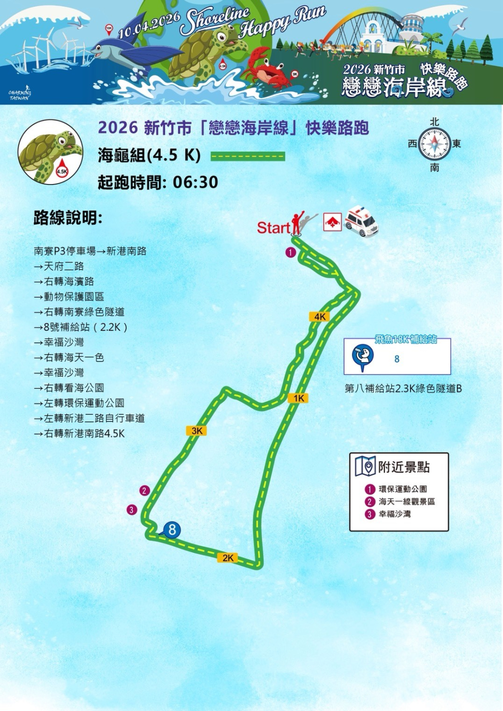 (4)海龜4.5K組路線 / 07:00 起跑南寮P3停車場→新港南路→天府二路→右轉海濱路→動物保護園區→右轉南寮綠色隧道→8號補給站(2.2K)→幸福沙灣🐟→右轉海天一色→幸福沙灣❤️→右轉看海公園→左轉環保運動公園→左轉新港二路自行車道→右轉新港南路4.5K