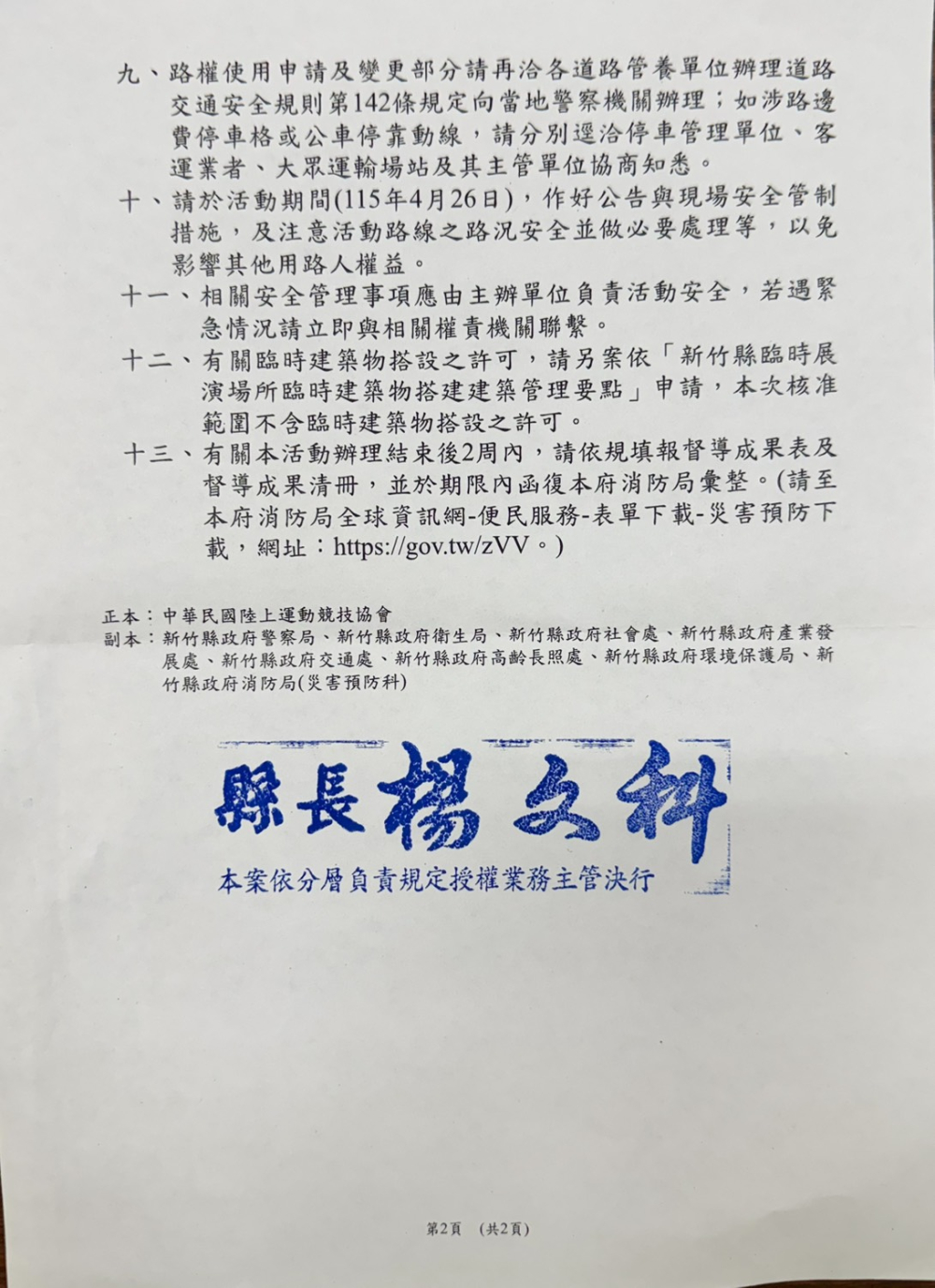 相關事項並已副知新竹縣政府警察局、衛生局、交通處、社會處、產業發展處、環境保護局及消防局等相關單位,以利活動期間協力配合。