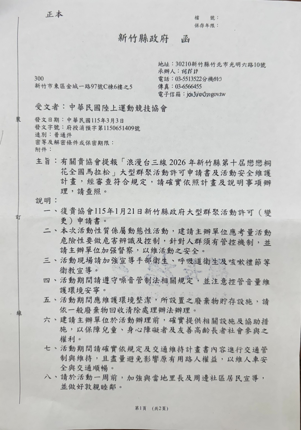 本會辦理之「浪漫台三線2026年新竹縣第十屆戀戀桐花全國馬拉松」,其大型群聚活動安全維護計畫已由新竹縣政府完成審查。