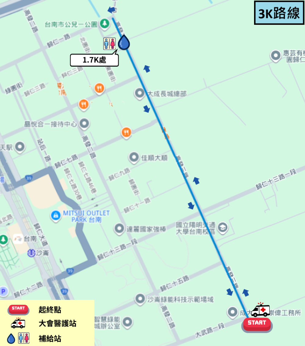 起點(大武路一段) → 高發三路 → 左轉 歸仁一路 → 右轉 台39線 → 右轉 中正南路一段 → 右轉 凱旋路三段 → 右轉 高發三路 → 終點(大武路一段)。 |