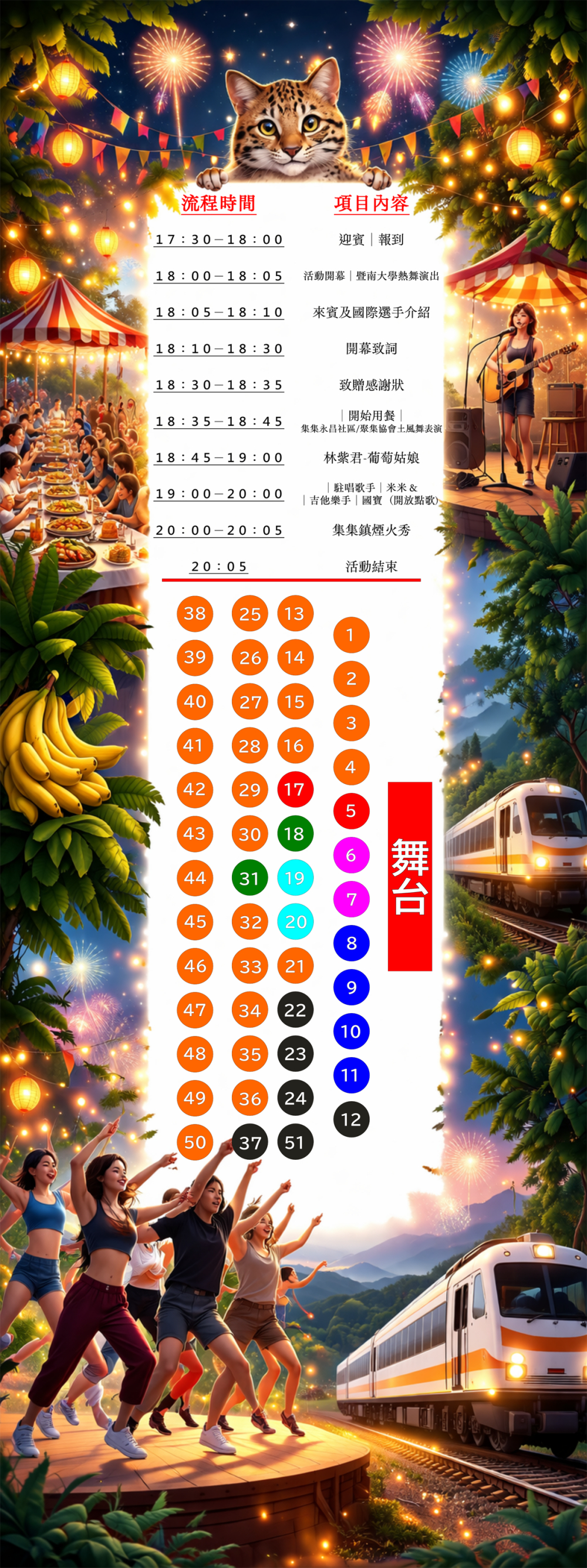 內容:備有當地風評有佳的總鋪師流水席及娛興節目表演。