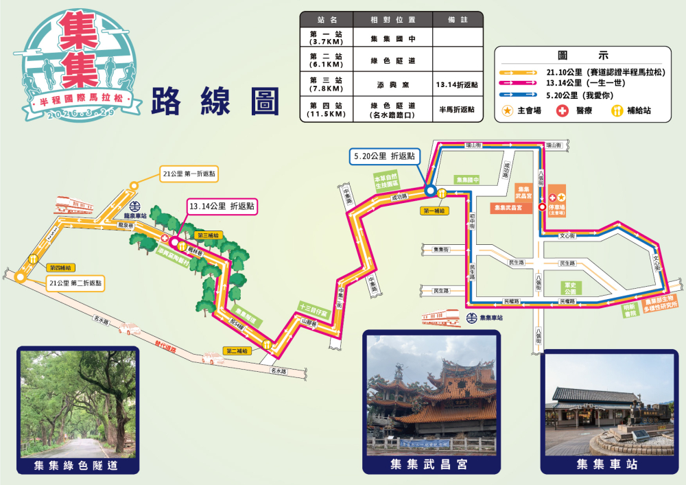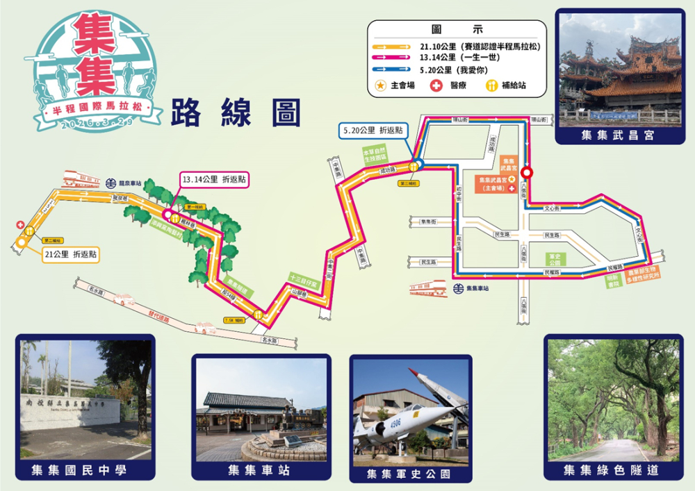 半馬21K (國際賽道) 路線 | 八張街武昌宮 → 文心街 →民生東路 →民權路 →初中街 →集集國民中學 → 成功路 → 中集路 →中集二街 → 集集街 → 投54線 → 山腳巷 →草嶺巷 → 楓林巷 → 龍泉巷(半馬第一次折返) →樂園巷 → 磨坑巷 → 半馬第二次折返 → 樂園巷 →楓林巷→ 草嶺巷 → 山腳巷 → 投54線 → 集集街 → 中集二街 → 中集路 → 成功路 → 集集國民中學→ |