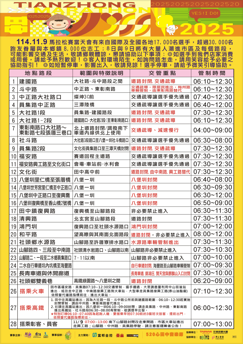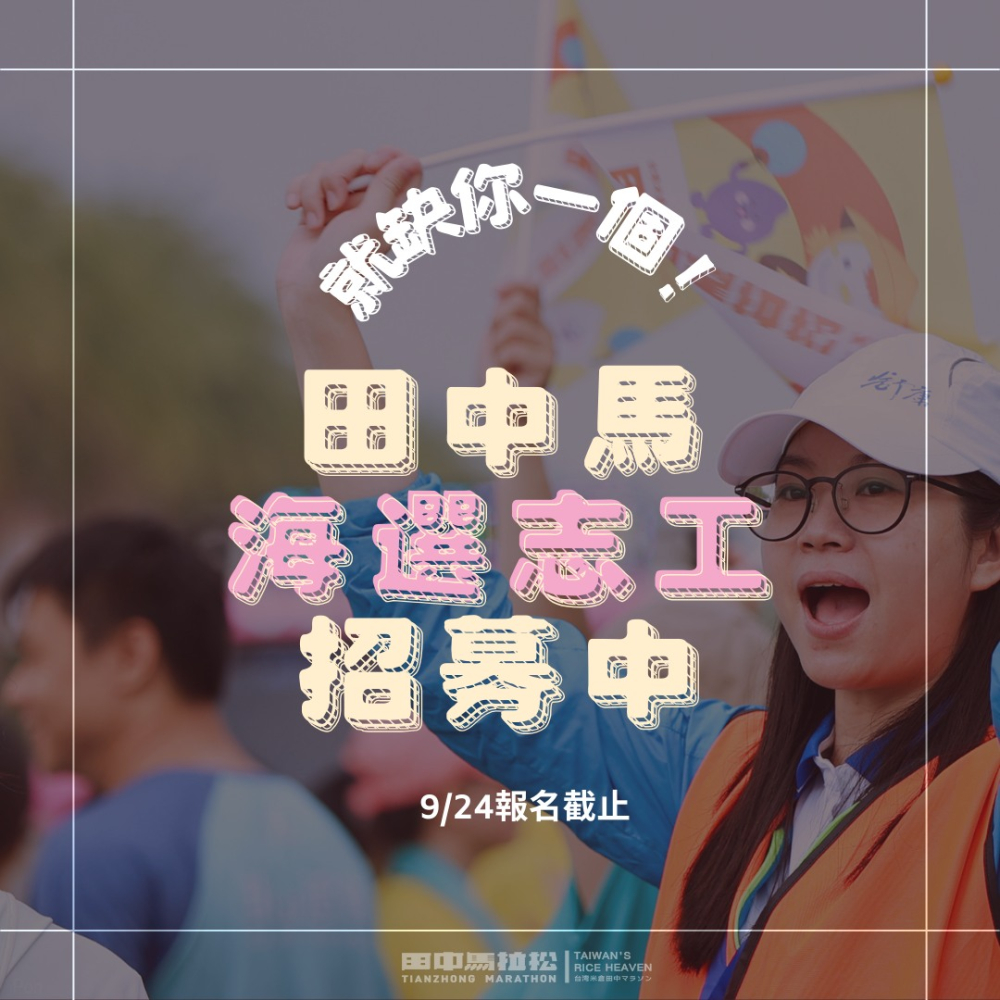 一場馬拉松賽中還有一個組別,免報名費但需要付出自己,也是成功賽事的要件之一【服務時間與地點】■服務時間:2025年11月08日(週六) 、11月09日(週日) 詳細服務時間詳閱海選志工報名網站■服務地點彰化縣田中鎮景崧文化教育園區-賽事志工中心(田中鎮中州路一段416號)【志工報名相關】■即日起至9月24日(三) 止,預計於10月3日(五)前Email通知錄取志工名單。■每個組別崗位人力有限,若想報名之組別無法點選即為額滿,可選擇服務其他組別,若仍想候補該組別,可於留言區留言。【志工大會時間地點】懇請各位務必出席■志工大會日期:2025年10月18日(六)下午14:30-16:00■志工大會地點:田中鎮田馨館集合(彰化縣田中鎮鎮政六街76號)感謝大家願意替選手服務、延續田中馬熱情的服務精神,今年誠摯邀請各位與我們共同攜手完成田中小鎮盛事,並在人生中留下最美好的回憶!