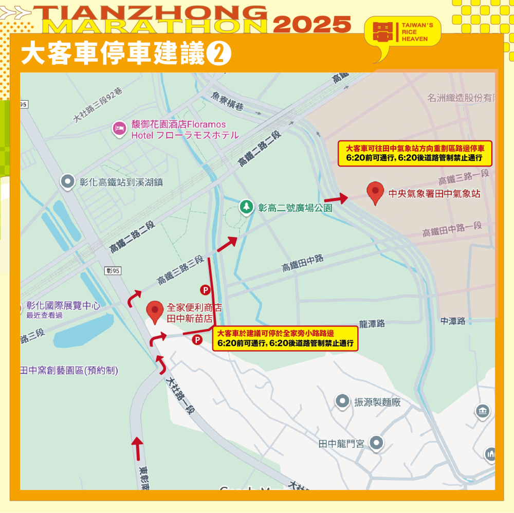 1.車輛建議停放高鐵彰化站周邊並轉乘停車接駁車,以免因尋找車位延誤您的起跑時間。