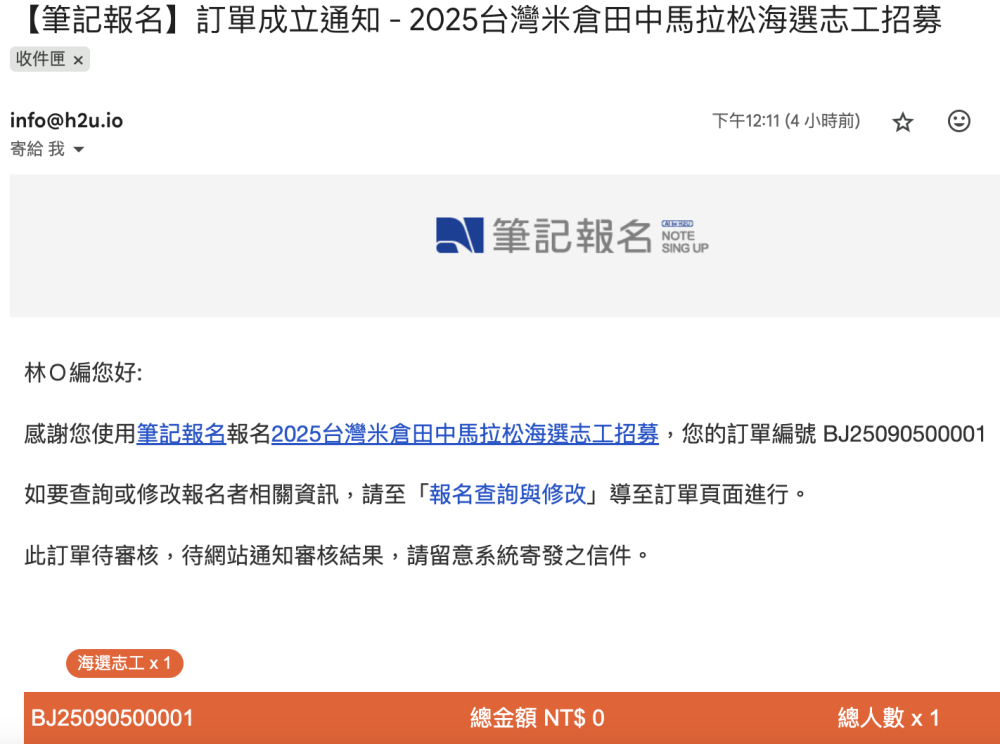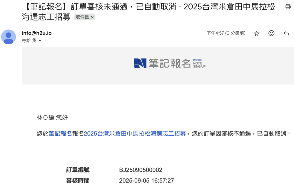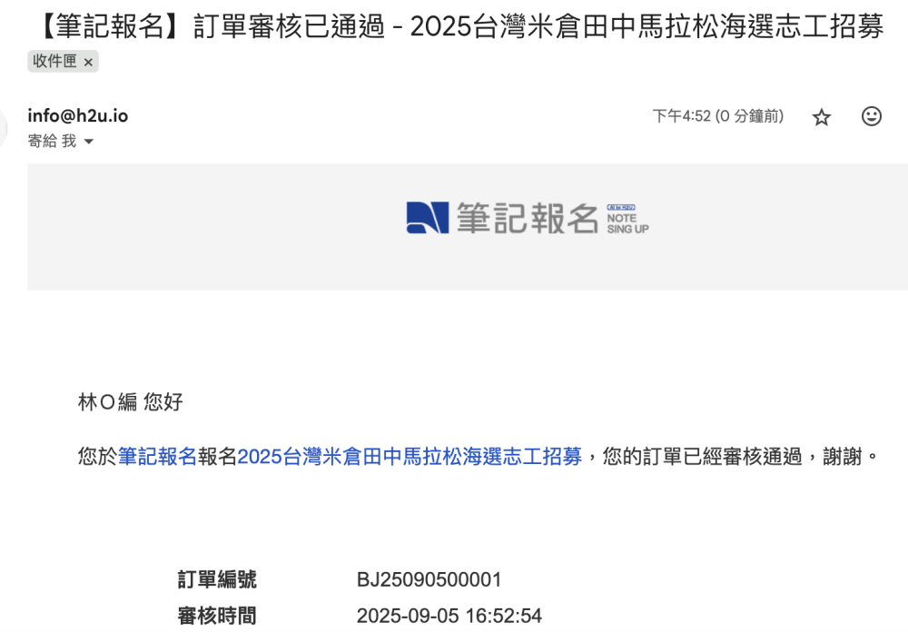 | 報名成功,資格待審核信件 | 資格審核通過信件 |