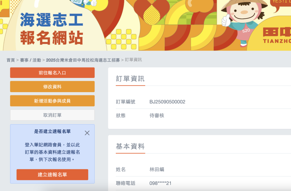2.報名後訂單狀態會是「待審核」,大會會統一審核資格,審核通過會email通知,訂單也會顯示已成立。