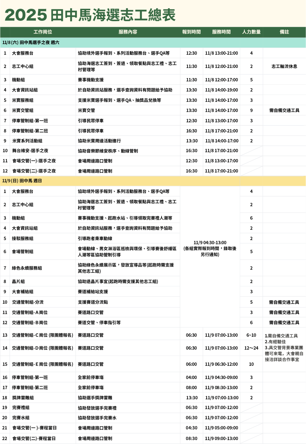 感謝大家願意替選手服務、延續田中馬熱情的服務精神,今年邀請您與我們共同攜手完成田中小鎮的台灣品牌國際盛事,並在人生中留下最美好的回憶!【志工報名資格】對運動賽事、活動服務有熱忱之民眾皆可。