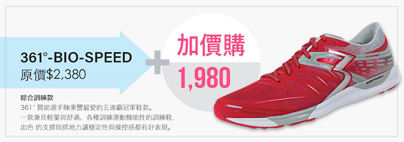 361° 贊助選手陳秉豐最愛的五連霸冠軍鞋款。一款兼具輕量與舒適、各種訓練運動機能性的訓練鞋,出色 的支撐與抓地力讓穩定性與操控感都有好表現。