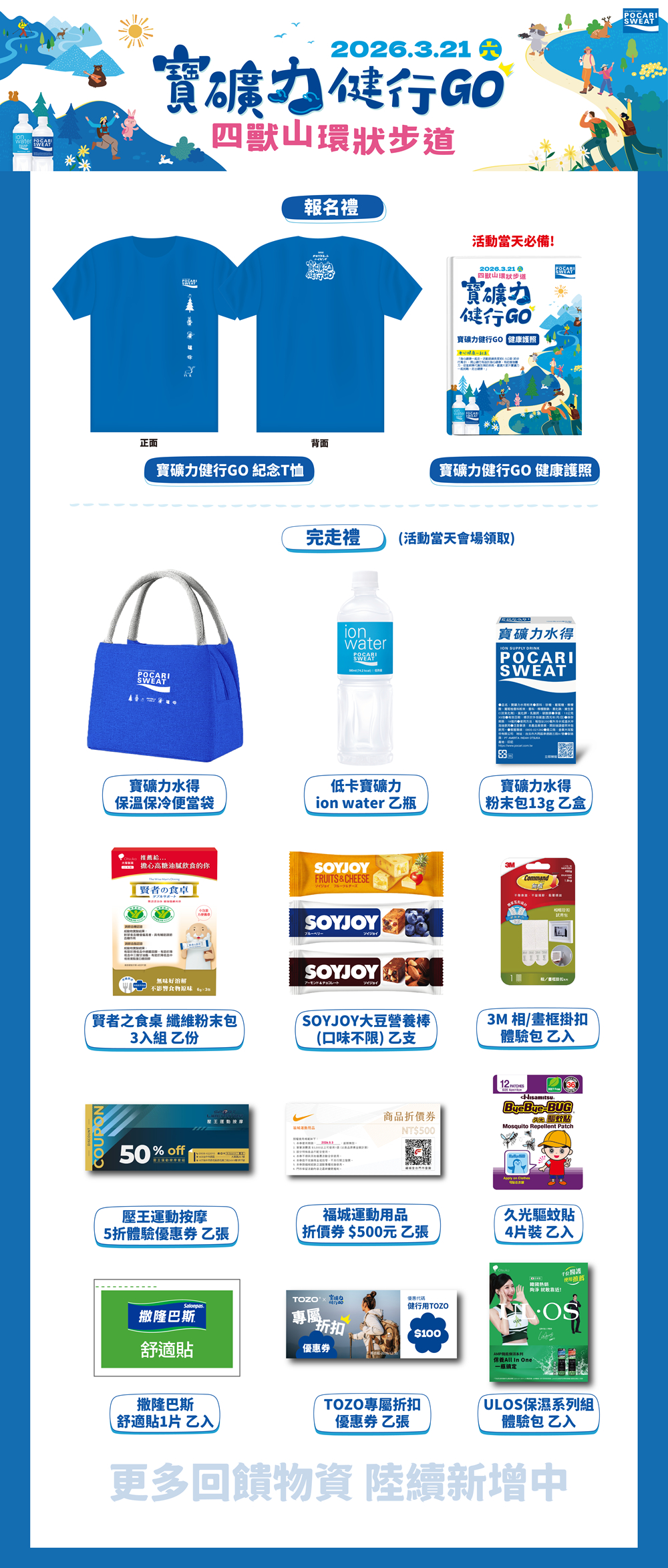 ●完賽贈品於3/21(六)活動當日完走後,憑寶礦力健行GO健康護照於活動會場發送。