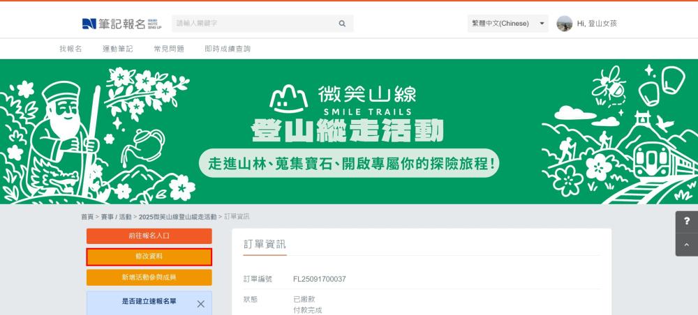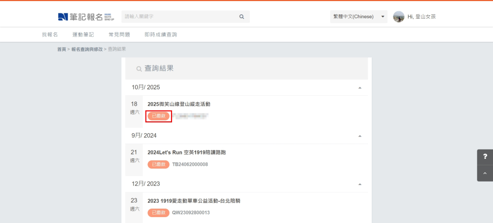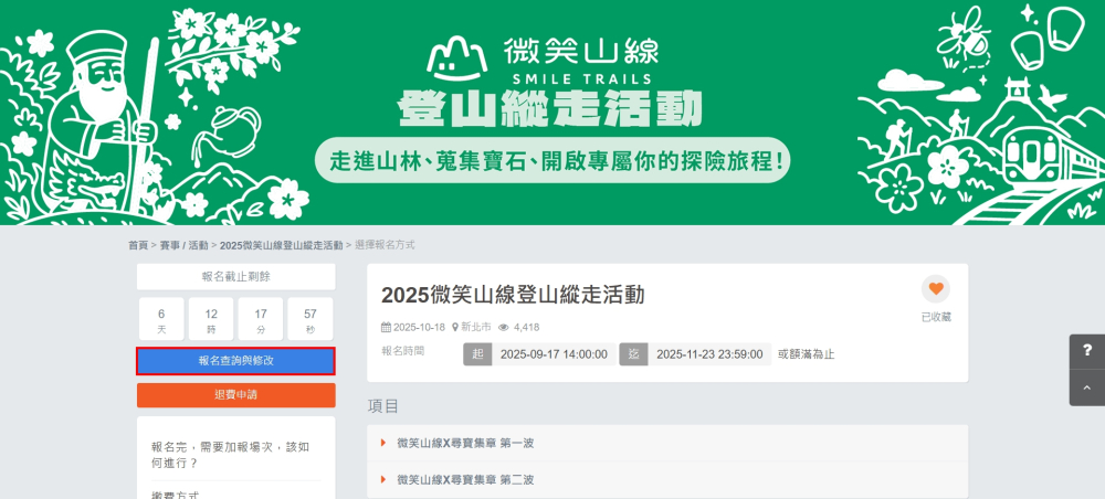 進入查詢結果頁面,點選先前已報名的2025微笑山線登山縱走活動