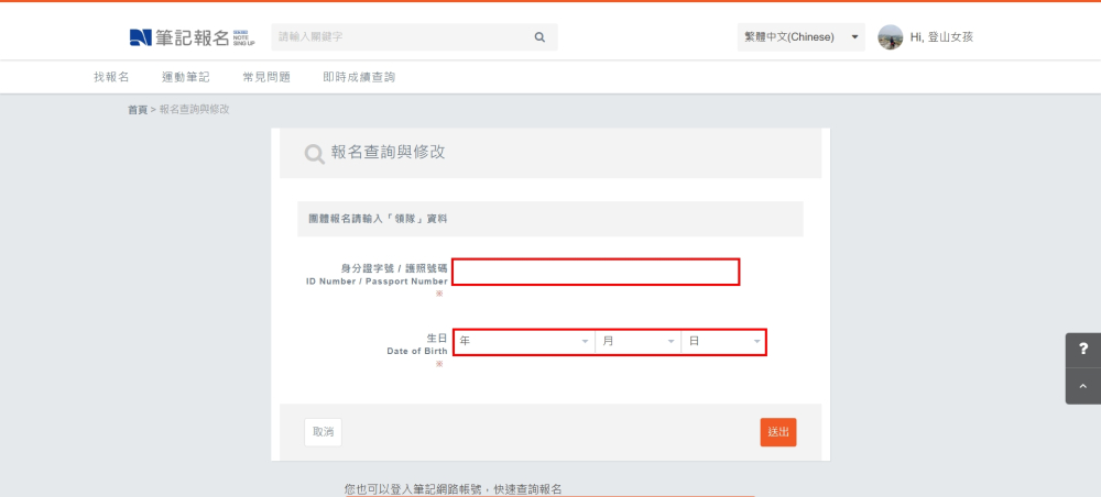 進入報名查詢與修改頁面,輸入身分證字號和生日