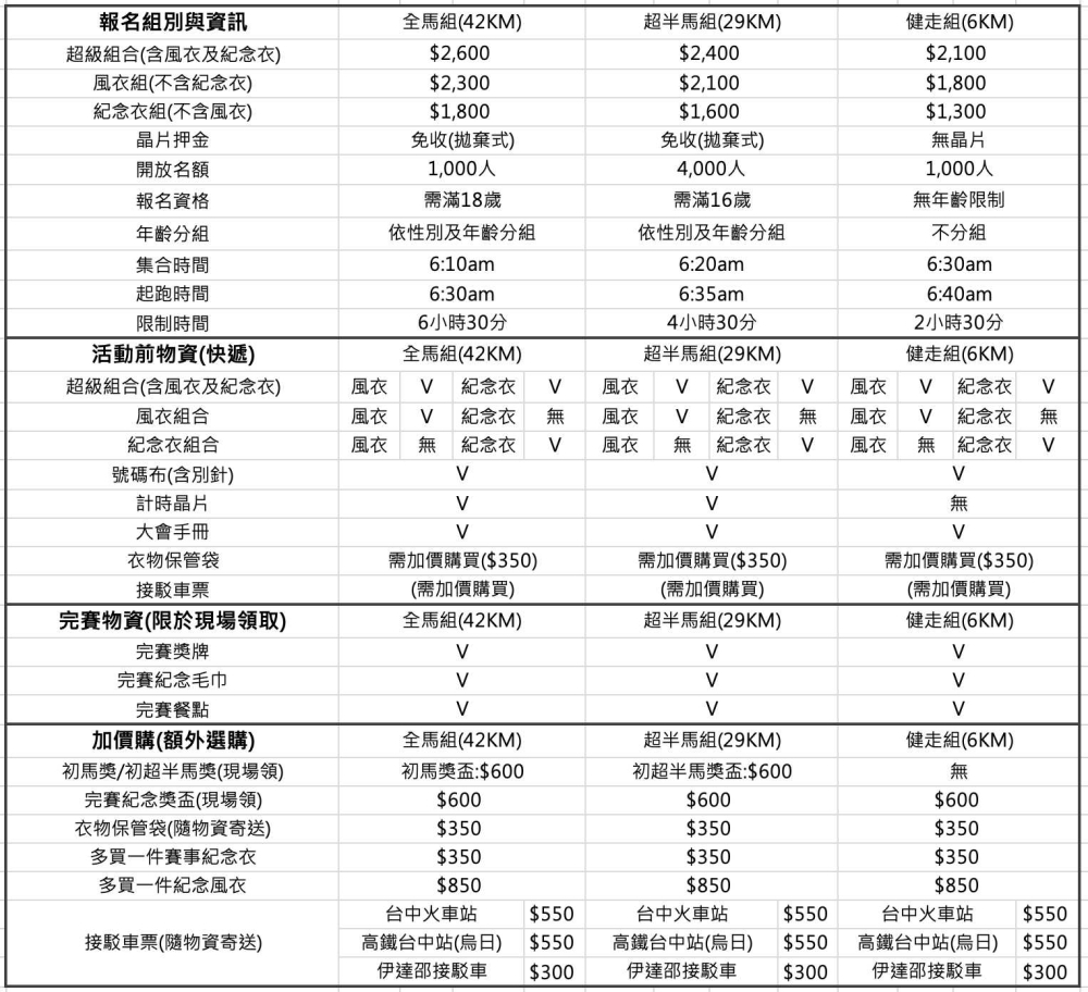 (3) 超值組合(紀念風衣及賽事紀念衣):42公里全程馬拉松組每人2,600元;29公里超半馬組每人2,400元;6公里活力健走組每人2,100元。