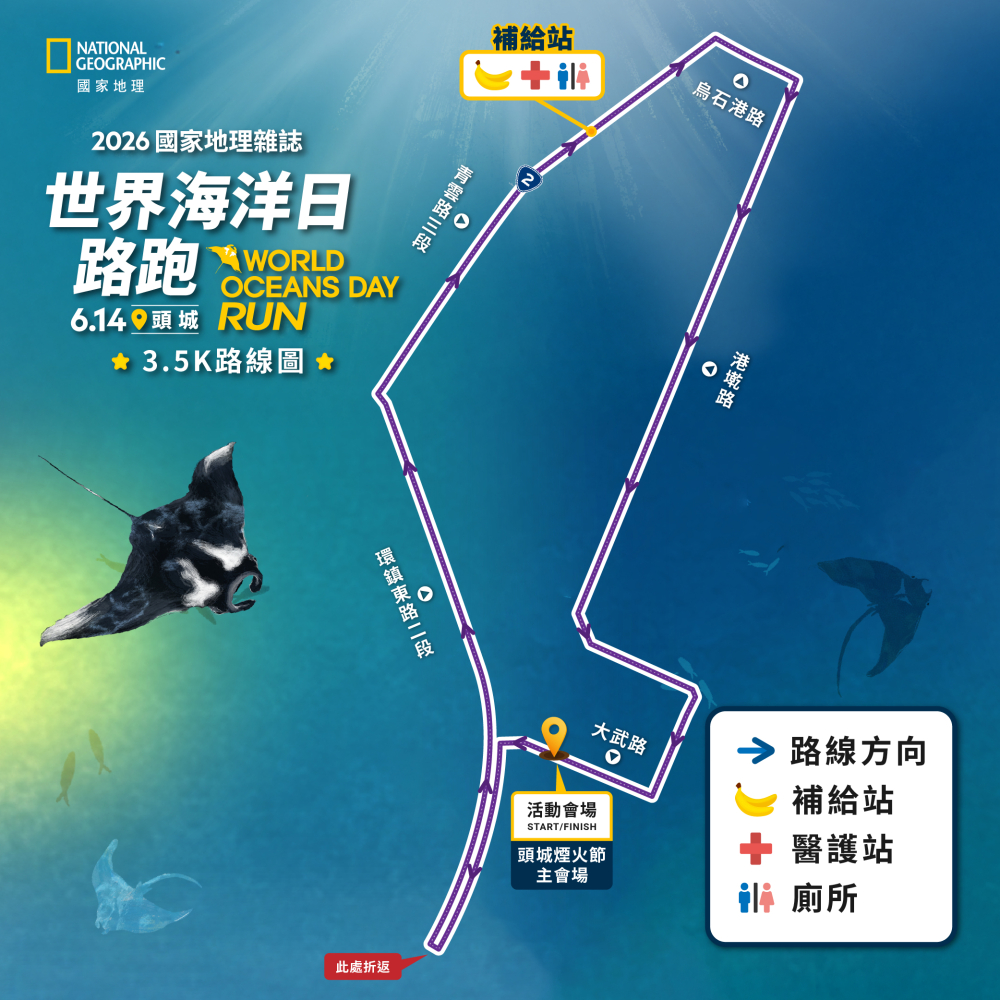 感謝大家對 「2026 國家地理雜誌世界海洋日路跑」 的熱情支持。為了提供更完善的活動體驗,本活動在 頭城鎮公所 加入後,主會場將調整至【頭城煙火節主會場】,我們將能運用更廣闊的場域,並加入在地的特色補給資源及系列活動體驗,為所有跑者打造一場優質的海洋保育活動。